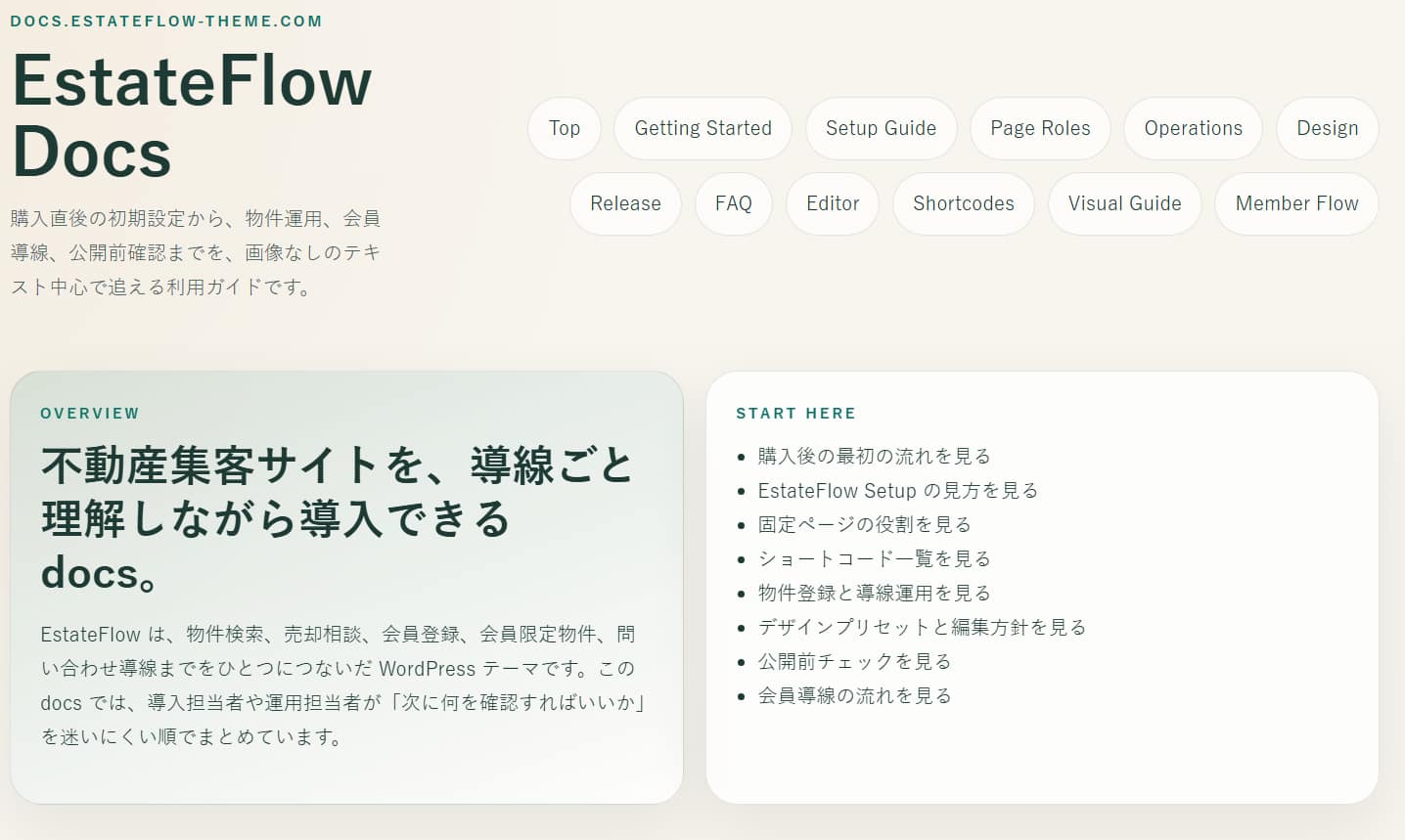 EstateFlow は、不動産会社の集客サイトに必要な導線をひとつにまとめた WordPress テーマです。