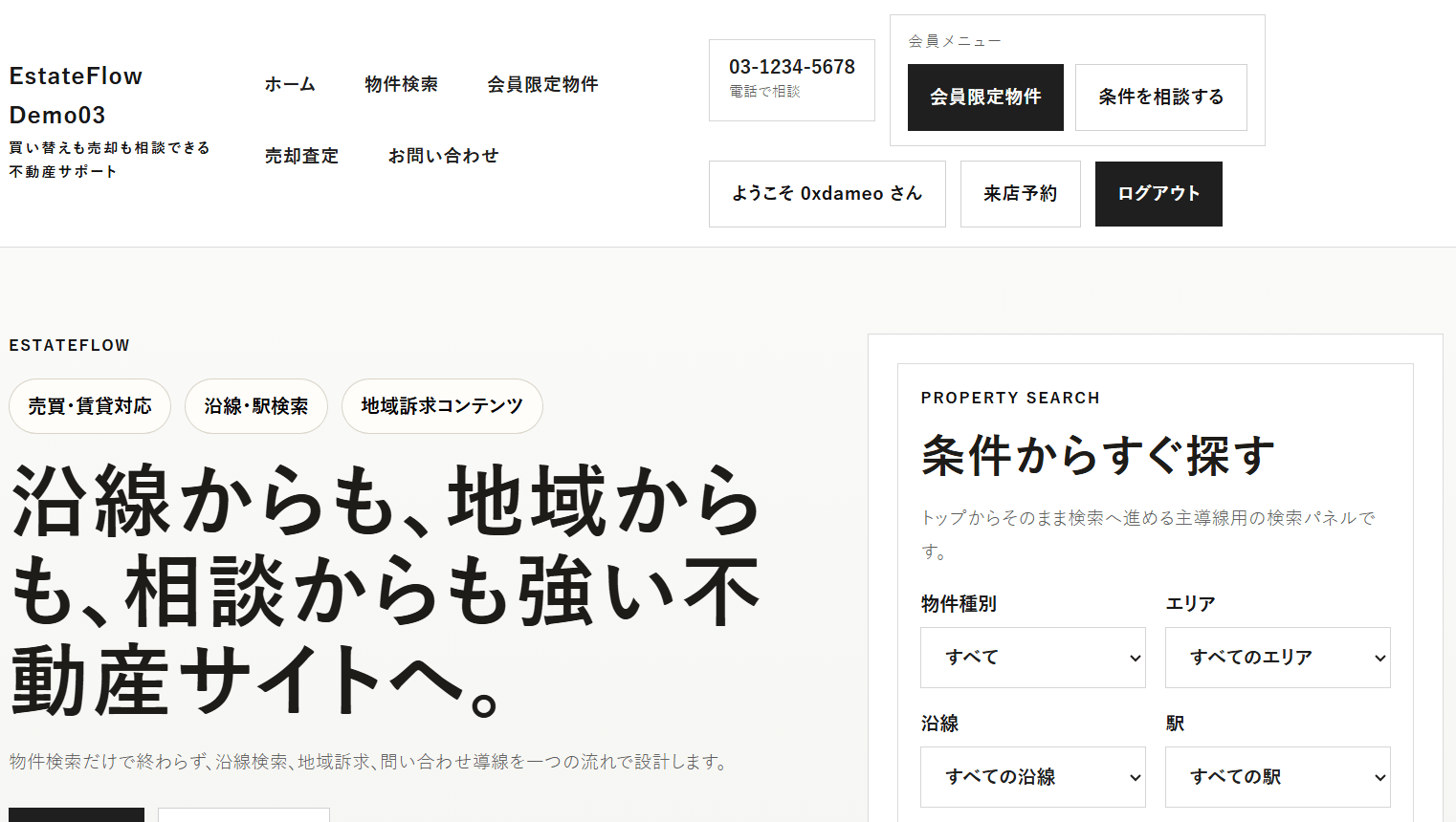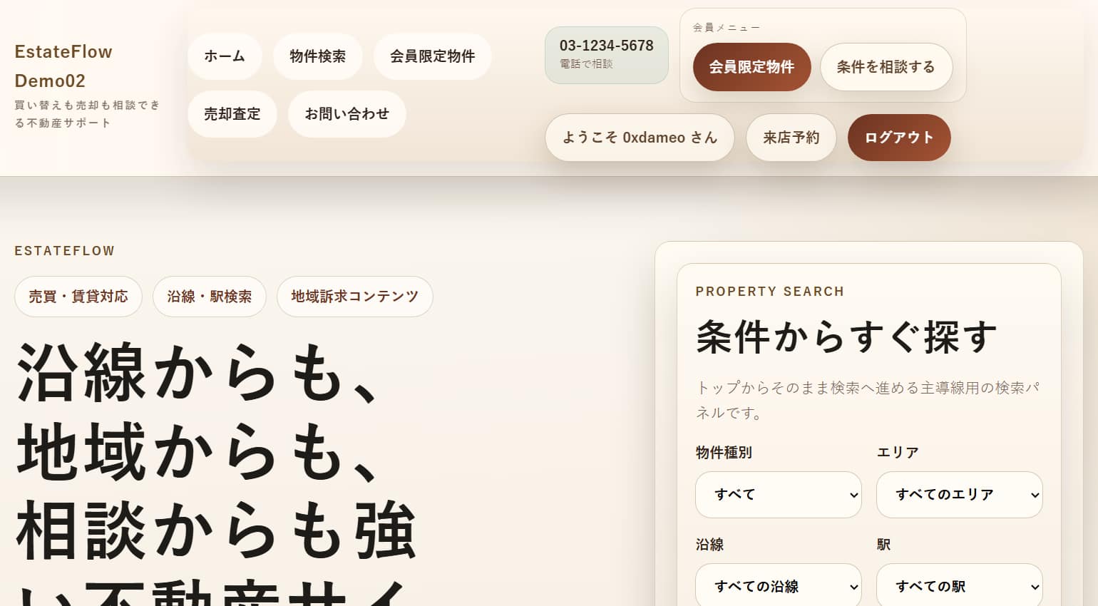 物件検索や物件詳細ページだけでなく、会員限定物件への導線、売却相談ページ、問い合わせページ、来店予約導線までを一体で設計しているため、単なる見た目のテーマではなく、反響獲得を見据えたサイトを構築しやすいのが特長です。